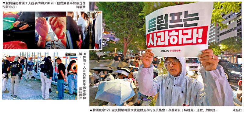 左上方:被监禁的韩国工人提供的图片表明,将其拘留在手铐中。 \ Yonghan新闻社;左下图:韩国工人在美国被绑在美国被捕并绑扎。互联网图像;正确的情况:韩国于12日在美国驻韩国大使馆附近举行了一次反美国集会,并举着一个口号,上面写着“特朗普,道歉”。美国执法机构在本月4日被佐治亚州的300多名韩国公民逮捕,引起了重大争议。一群人于12日返回韩国后,韩国媒体在14日发布了一份秘密的“日记拘留”,宣布,当韩国的工人被“羞于作为囚犯的战争感到羞耻”,当他们被忽视时,他们被忽略了,例如清脆的床,芬芳的水和需要帮助但受到忽视的孕妇。韩国总统办公室在韩国第15韩国说,韩国公民目前,TES涉及双方之间的关税也已陷入僵局。 317个韩国公民。在韩国的外交努力之后,其中316人于12日返回韩国。 “拘留日记”暴露于不良治疗中。 Yonhap新闻社在14日发布了一名被捕的韩国工人的“拘留日记”,透露韩国工人仅限于带有霉菌床,芬芳的水,没有时钟和窗户的临时集体宿舍。审讯官员无法解释他们被撤职的原因,他说“上级认为这是非法行为”。日记是由韩国公民秘密撰写的,有时是在克制上以化名的。他与有效的B-1商务签证一起去了美国参加商务会议和培训,但仍然被指控Ating工作签证法规。一个人在日记中透露,在第四届美国许多美国执法机构的突袭和搜查就像“军事行动”。白天,大约有400个联邦和州执法国家参加了该行动,并派出了直升机和无人机。一个说他没有被判入狱,认为这是一个常规的询问:“结果,他们突然拿起手铐并没有解释就锁上了我们。”工人被绑在手铐,腰带和囚犯等束缚上,然后带到冰拘留所,并被要求脱下衣服并进行身体搜索。拘留中心说,有数百人在宿舍风格的细胞中挤压,这很冷,只能在热毛巾中使用微波炉。床垫是霉菌,水闻起来很差。医疗服务有限,一名孕妇被忽略以寻求帮助。有人透露,美国官员在他们的三天之前没有给出任何解释克制。在审讯期间,他询问官员们为什么通过法定签证进入该国后被限制。该官员说,他不清楚:“上级认为这是非法的。”日记结束时发出的愤怒表示,美国将其公民“如尴尬的战争囚犯”对待。韩国提供了一个大礼品袋,并被美国刺伤。这本日记激发了韩国的反应强烈。南总统说,李·杰明(Korea Lee Jae-Ming)说,“这些韩国人民的权利受到了不当侵犯”,这一事件将使韩国的公司犹豫在美国投资。韩国总统办公室在15日表示,韩国将检查韩国公民是否受到美国的限制。韩国外交部强调,对相关问题进行了充分的调查,并采取必要的步骤。面对强烈的抗议韩国,美国总统特朗普在社交媒体上发布了许多产品的第14个产品,例如芯片,半导体,计算机等,美国人员应向外国员工学习,并希望外国公司的专业和技术人员可以帮助我们培训美国人员。特朗普还说,他不想“预防或阻碍”对外国人和外国人的投资,“我们接受他们及其雇员。”公众对韩国的看法认为,特朗普政府的传染性言语和行为和逮捕行动和逮捕行动被震惊,愤怒,并由朝鲜人替换。韩国的一些政党表示,这一事件已将这一“韩国”带到韩国。韩国在贸易协定中给美国提供了一个“投资礼品套餐”,但“陷入了背景”。银行的银行贷款和保证。美国商务部长卢特尼克(LutnikES或它可以将商定的15%关税恢复到25%。作为回应,韩国总统办公室不愿拒绝拒绝进行谈判,而不是公平。 (综合报告)