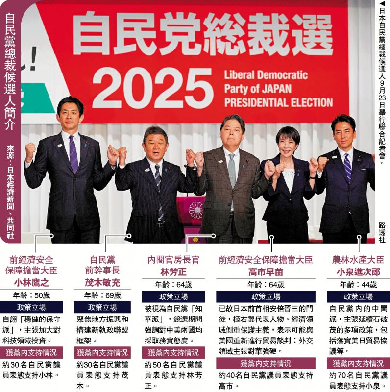 照片:日本自由民主党总统的总统于9月23日举行了一次联合会议。 Pauttern Lin Fangmae, who has a pattern of Lin Fangmae, has been a pattern of Lin Fangmae, who has a pattern of Lin Fangmae, who has a pattern of Lin Fangmae, has a pattern of Lin Fangmae, who has a pattern of Lin Fangmae, has a pattern of Civine Lin Fangmae, with a Pauttern Lin Fangmae, with a Paper Papertern Lin Fangmae.有三英尺。预计第一个投票周期将很难确定结果,而投票最多的两个人将以更高比例的选票参加对议会议员的最终选举。虽然是自由主义者在政治捐赠丑闻被暴露之后,民主党已经发起了多数席位,前总理塔罗·狗(Taro Dog)和富米奥·基希达(Fumio Kishida)有权发言,而库苏米(Koizumi)和高什(Takashi Camps)正在争夺他们的支持。 [ta if pao新闻]自由民主党总统以每人一票的方式采用了295个民主党的自由派成员的形式,普通政党成员和各个领域的注册支持者已被成比例地转换为295票。那些在第一个投票周期中获得超过一半的选票的人可能会当选;如果没有人获得超过一半的选票,那么获得前两票的候选人将参加径流选举,而295 MP中的每一个都将每人一票,而47个自由民主党联合会联合会的州和县将进行投票,选票的获得者将被选举。对党员和党派朋友的首次投票以第三次结束,结果在国会议员4日投票后表示。预计自由民主党将在15日举行临时议会,为总理举行选举。由于反对党很难联手选择总理,因此自由民主党的新总统很有可能取代Shigeru Ishiba担任新总理。参加自由民主党总统大选的五名候选人是Kamijiro Koizumi,Takashi Saina,Yoshimasa,前经济安全部长,Kobayashi Takayuki和Toshisuke Motegi,前自由民主党的秘书长Toshisuke Motegi。富士电视台在第三次发行的党员和朋友的投票趋势调查结果表明,高西城领导了17个地方,包括他的家乡奈良县。考苏米(Koizumi)领导着15个地方,包括他的家乡卡纳那川(Kanagawa)县。普林方(Plin Fang)通往4个地方,包括他的家乡山口州。 Nihon Keizai Shimbun报道说,Koizumi得到了大约70名议员的支持,他们首先排名;约有50名议会成员表示了林·范·曼斯特(Lin Fangmaster)的支持;大约有40名高什议会支持; Kobayashi和Mogi各自获得了30名议员的支持,而其他12名成员尚未表达他们的观点。候选人名单缺乏新鲜度。在2023年底将丑闻暴露于政治民主民主党之后,涉及丑闻的主要派系将是disband,而塔罗狗(Taro Dog)领导的狗的唯一部分被留在后面。但是这次选举仍然有一个独特的派系。在第三名中,Hara Kishida派系负责人的芋头狗和富米奥·基希达(Fumio Kishida)获得了支持。 Takashi Saenai和他的狗队也有很多次。一些分析师认为,如果举行第二次投票转折,Motegi Toshisuke Motegi的前领导人将与与他密切相关的狗,这意味着大多数狗支持的候选人也将获得Motegi支持者的选票。在竞选期间,候选人主要关注经济和经济问题,并避免对敏感问题发表意见。在外交方面,领导支持的Koizumi,Takashi和Lin Fangmashi都促进了日本 - 美国联盟。被认为是“中国知识学校”的林·范(Lin Fang)与中国接触越来越务实。 8月15日,在IT年级的Koizumi,Kobayashi Takayuki将前往Yasukuni神社“崇拜鬼魂”,日本专家警告说,这一举动严重影响了日本与中国和韩国的关系。高什(Gao Shi)上周说,如果他成为总理,他将考虑“崇拜鬼魂”的外交影响。日本经济学家Kazuyuki Hamada说,所有五名候选人都参加了总统的最终选举,这很难实现J亚得尼斯,这也表明日本正处于政治问题上。他说,在许多问题的影响下,例如政治捐款和不断提高的价格,自由民主党后来在众议院和参议院选举中丧生,以及自由民主党和科梅托党成立的裁决联盟在这两个房屋中成为“少数党派”。 Takashi认为仇外心理会完善舆论反弹。 Jinjiro Koizumi是前日本总理Junichiro Koizumi的次子。他继承了丰富的政治资源,并很好地利用了社交媒体来吸引年轻选民。但是,讨论了他缺乏管理经验和个人能力。上个月,日本媒体宣布,考苏米的竞选团队要求支持者在视频网站上“表达赞美”。这一事件引起了人们的不愉快性,而库木要求从选举中退出已成为社交媒体上的热门话题。这由参与党领导的日本人右边的部队促使仇外心理,并从自由民主党中夺取了许多保守的投票。自由民主党总统的候选人也对外国人的问题发表了艰难的陈述,但这是公众舆论的反弹。高什·塞米(Takashi Saemi)在竞选演讲中指出了“外国游客踢”的未经证实的声明,相关人员迅速前进以拒绝。 (综合报告)